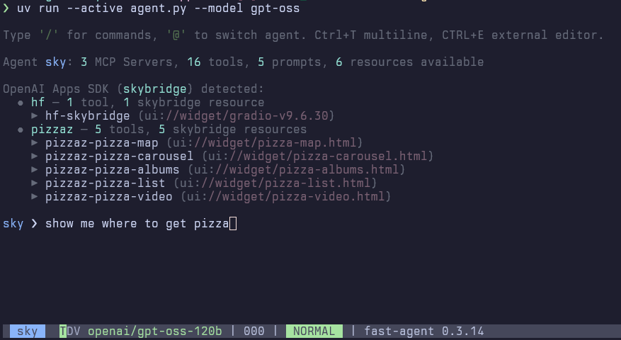 fast-agent automatically detects OpenAI Apps SDK (Skybridge) integrations exposed by MCP servers. Detection runs during tool/resource discovery: the aggregator looks for tools that publish an openai/outputTemplate _meta entry and the corresponding ui://… resources with the text/html+skybridge MIME type.